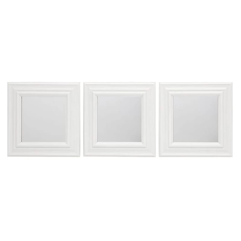 Mirrors just add a touch of glam anywhere they’re placed, and our 10in white square mirror 3-piece set is no exception. Whether you’re looking at one last glimpse before you leave the house, or just brighten up your living spaces, adding a mirror like this one is a great option for a useful, decorative accent in your home. Reflect on this, our white square mirror 3-piece set is a gleaming touch for any living space. And since mirrors have the added bonus of reflecting light, this piece, wall mounted or leaning is sure to make a living room or bedroom feel even larger.