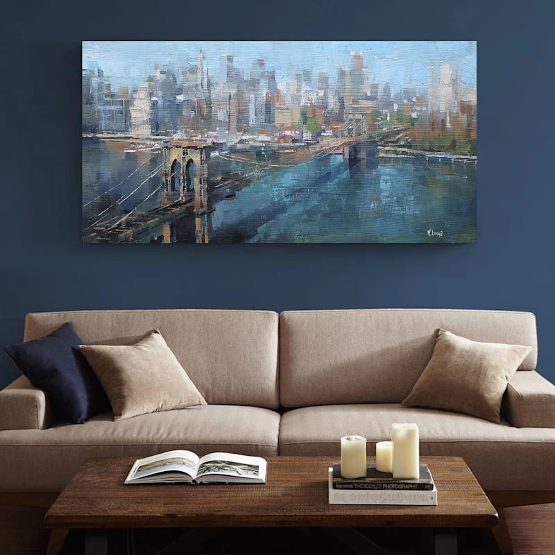 They say beauty is in the eye of the beholder. Art is too. Add a little character to any room in your home with our 60x36in. Brooklyn Bridge embellished canvas wall art. The possibilities are endless with this blue, grey, ivory, brown and black multi wall decor. A multicolor blurred Brooklyn city landscape motif creates visual interest against a visually interesting backdrop. Hang this wall decor to make a bold statement and to add a touch of personality to your home decor.