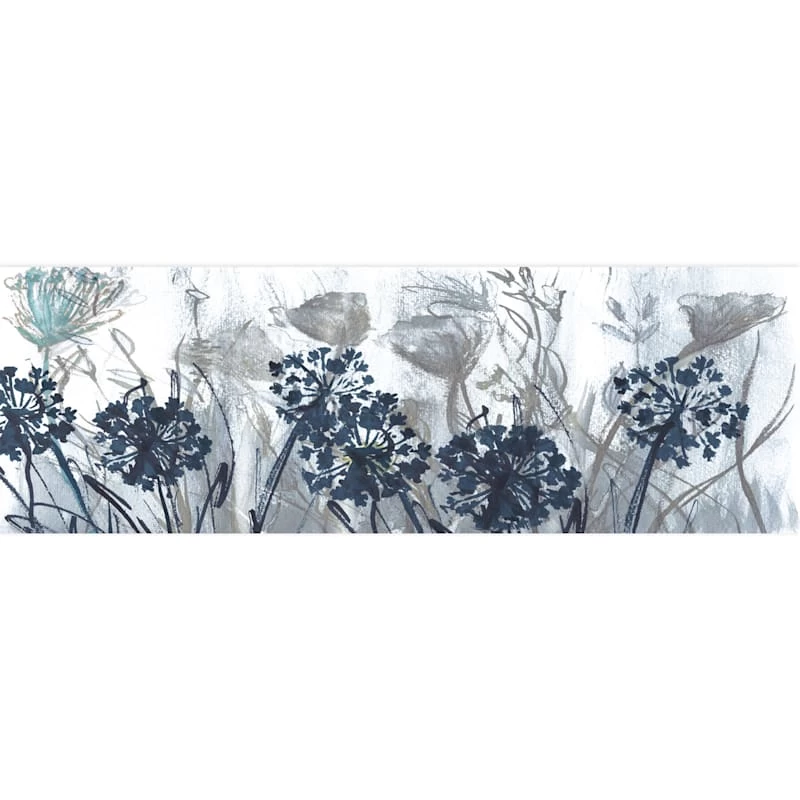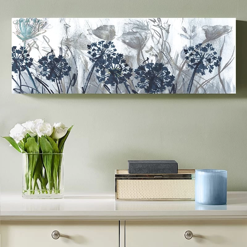 They say beauty is in the eye of the beholder. Art is too. Add a little character to any room in your home with our 36x12in. Indigo Field canvas wall art. The possibilities are endless with this navy blue, grey, aqua and white wall decor. A multicolor multiple floral field motif creates visual interest against a visually interesting backdrop. Hang this wall decor to make a bold statement and to add a touch of personality to your home decor.