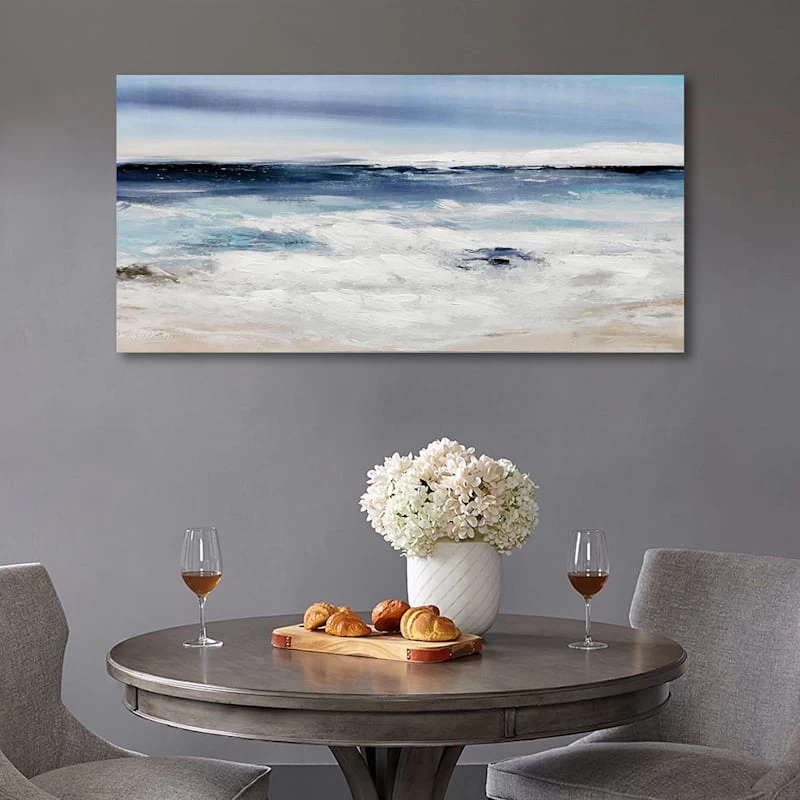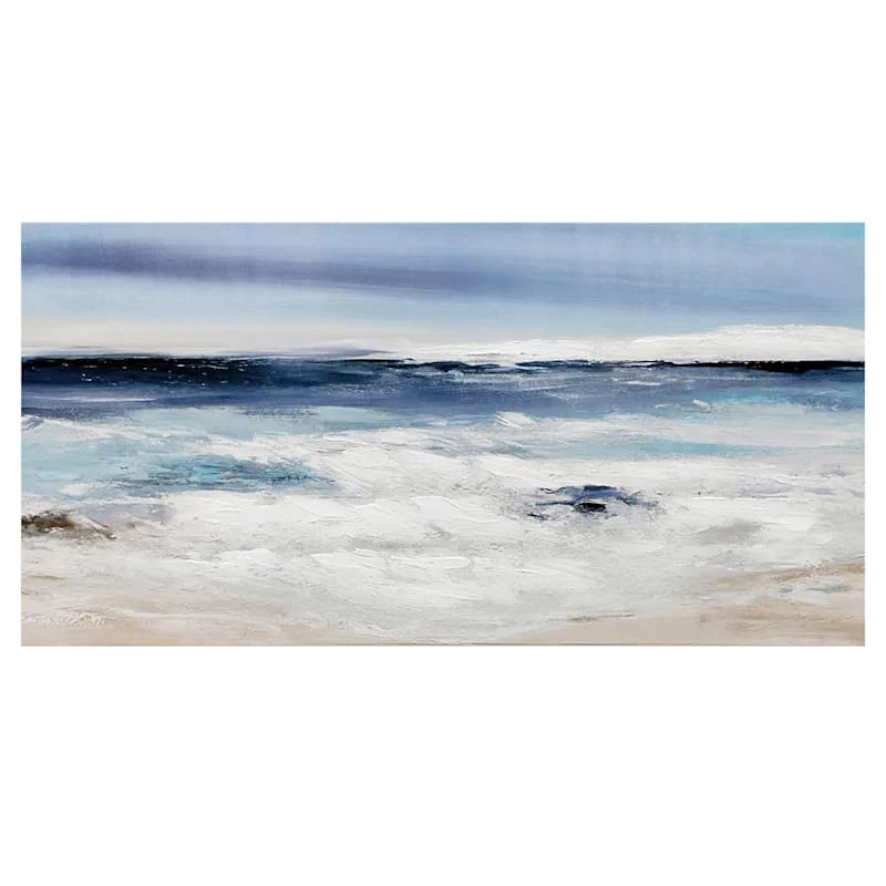They say beauty is in the eye of the beholder. Art is too. Add a little character to any room in your home with our 48x24in. Long Beach embellished canvas wall art. The possibilities are endless with this blue, white, ivory and natural wall decor. A scenic oceanfront and sky motif creates visual interest against a visually interesting backdrop. Hang this wall decor to make a bold statement and to add a touch of personality to your home decor.