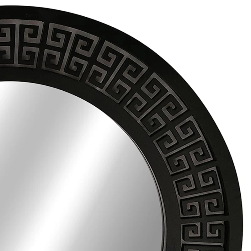 A collection that lets everyone relax in style. Polished finishes and classic hues pair with fun finds. Providence is where elegant settings still feel comfortable and warm – exclusively At Home. Mirrors just add a touch of glam anywhere they’re placed, and our 31.5in diameter black Grecian Key wall mirror is no exception. Whether you’re looking at one last glimpse before you leave the house, or just brighten up your living spaces, adding a mirror like this one is a great option for a useful, decorative accent in your home. Reflect on this, our manufactured wood black framed mirror is a gleaming touch for any living space. And since mirrors have the added bonus of reflecting light, this piece, wall mounted, or leaning is sure to make a living room or bedroom feel even larger.