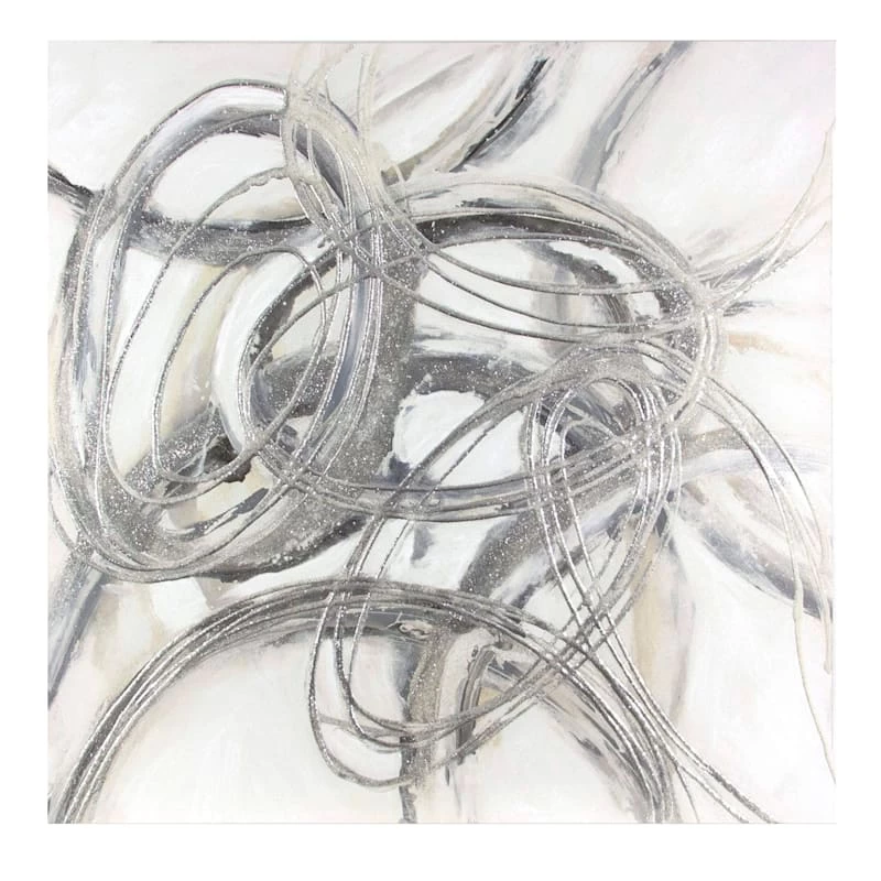 Add immense interest, glamour and contemporary style to any room with our Silver Loops textured canvas wall art. The grey, silver and ivory hues and silvery metallic detailing bring to mind an abstract dance that creates beautiful motion on the canvas. This 40″ x 40″ print will be the focal point of any living area where this spectacular piece is placed.